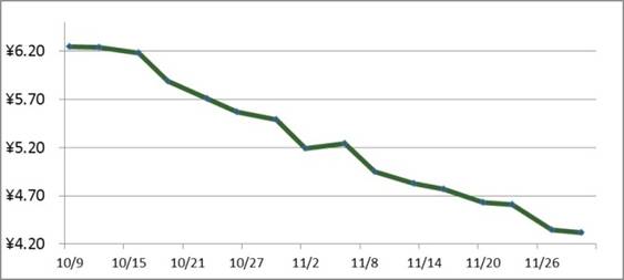 2012年蘋果收購價格開始時較高,但很快回落,收購價格大大低于2011年。2012年蘋果收購價格低的主要原因:全國蘋果產量大,供大于求,經營者連年虧,收果的果商少了,買的人少、賣的人多,和前兩年收購時的情形反過來了。收購價格低和收購量少,也促使果農自存果比例增加。蘋果(紅富士,80#二級以上)收購價格情況見下圖: