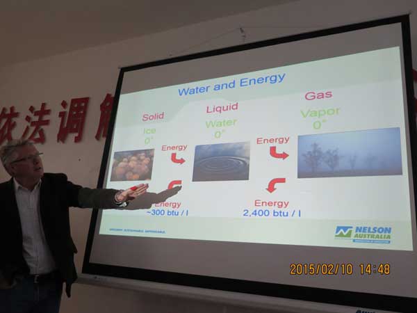 霜凍是一種氣象災(zāi)害,其造成的損失不可估量。凱利先生在果園噴水抗霜凍方面的研究比較深入,他重點(diǎn)介紹了噴水抗霜凍原理及方法并參觀了寶雞華圣果業(yè)公司的苗圃基地和在建的種植基地。