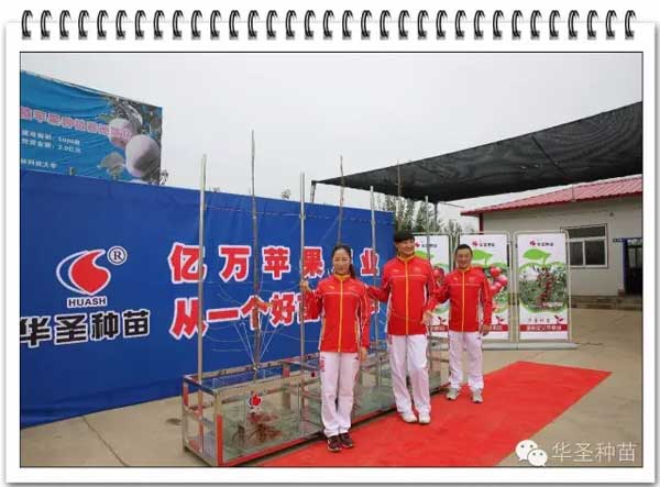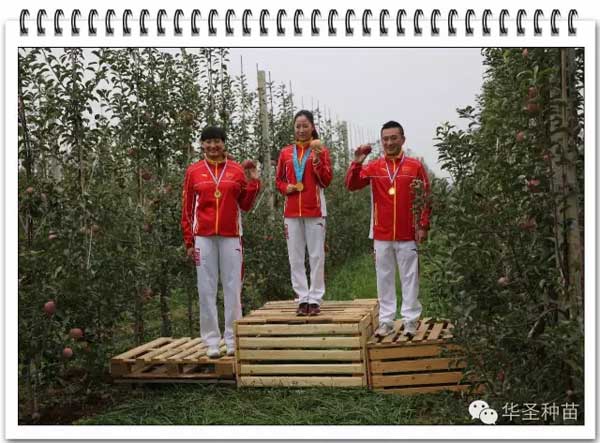 2016年10月11日,寶雞華圣基地迎來了歷屆奧運冠軍得主,競走奧運冠軍王麗萍,跳水奧運冠軍肖海亮和女排主攻手奧運冠軍楊昊,這三位奧運冠軍來到崔家頭種植基地,看到不同于傳統蘋果園的場景,他們都很驚奇,原來蘋果還可以這么種植,就像我們的奧林匹克運動,都是在不斷創新和摸索中尋求突破。我們的工作人員也是煞費苦心,為了迎接他們的到來,在園區蘋果樹行之間用檢疫木架框搭起了領獎臺,也是展現我們華圣蘋果苗木質量的一種形式。奧運冠軍們看到這么誘人的蘋果,也要拍照留念,不僅為自己代言,也為我們的蘋果質量代言。